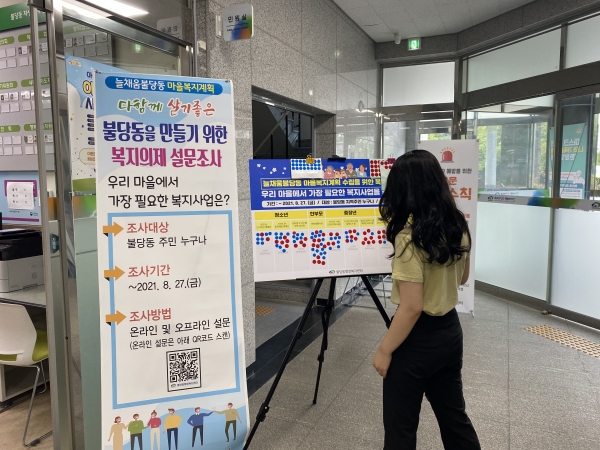 ‘늘채움불당동 - 주민이 주도해 함께 채워나가는 마을 만들기’라는 마을 비전을 내세우고 청소년 대상 스마트폰 중독예방 캠페인 한부모 대상 문화생활지원 중장년 대상 1인가구 사업 노인 대상 생신상 차려드리기 사업 등 총 10가지 마을복지의제들 중 주민선호도 투표를 진행한 것으로 결과를 토대로 사업을 선정해 2022년 마을복지사업에 반영할 계획이라고 전했다.
