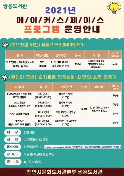 [세종타임즈] 천안시 쌍용도서관은 4차 산업시대에 창의 인재 육성 및 메이커 문화 확산을 위해 지역주민을 대상으로 2021년 ‘메이커스페이스 프로그램’을 코로나19 확산 방지를 위해 비대면 온라인으로 운영한다.