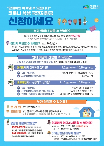 9월 13일부터는 카드사와 연계된 은행창구를 통한 신용·체크카드, 읍면동 행정복지센터를 통한 천안사랑카드·선불카드 등 오프라인 신청을 받는다.