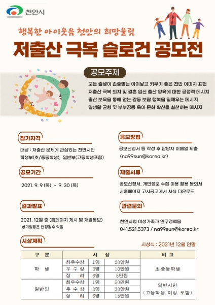 공모 주제는 모든 출생이 존중받는 아이낳고 키우기 좋은 천안의 이미지 표현 결혼은 행복, 출산은 감동, 자녀는 희망, 육아는 부모와 아이가 함께 성장하는 것이라는 감성을 일깨워주는 메시지 출산 보육을 통해 얻는 감동과 보람 행복을 일깨우는 메시지 일·가정 균형 및 부부 공동 육아 문화 확산을 실천하는 메시지이다.