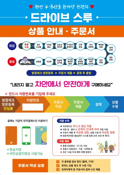 주문한 상품은 원하는 날짜와 시간을 선택해 천안시청 옆 시민체육공원 주차장에서 차량을 이용해 받을 수 있으며 판매현장은 안심콜 시스템과 거리두기 유지 및 소독으로 방역수칙을 철저하게 지키며 운영될 예정이다.