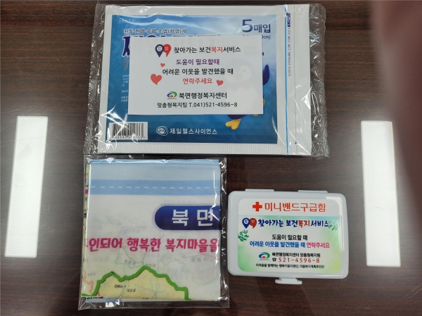 [세종타임즈] 천안시 북면 맞춤형복지팀이 복지사각지대 발굴을 위해 북면 관내도가 그려진 손수건, 파스, 미니밴드구급함 등 홍보물품을 제작했다고 30일 밝혔다.