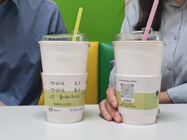 캠페인 참여방법은 오는 7일까지 천안시청 내 카페에서 음료를 주문하면 아동학대 예방 문구가 적혀진 종이 컵홀더를 받을 수 있다.