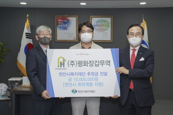 [세종타임즈] 주식회사 평화장갑무역이 지난 18일 천안시 취약계층을 위해 사용해 달라며 천안시청 시장실에서 천안시복지재단에 후원금 1000만원을 전달했다.