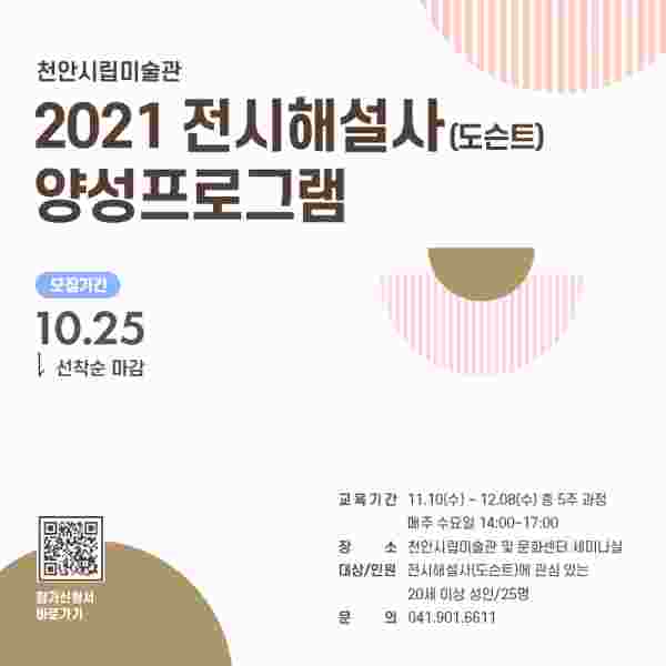 [세종타임즈] 천안문화재단 천안시립미술관은 오는 11월 10일부터 진행하는 ‘2021 전시해설사 양성프로그램’의 참여자를 10월 25일부터 모집한다고 밝혔다.