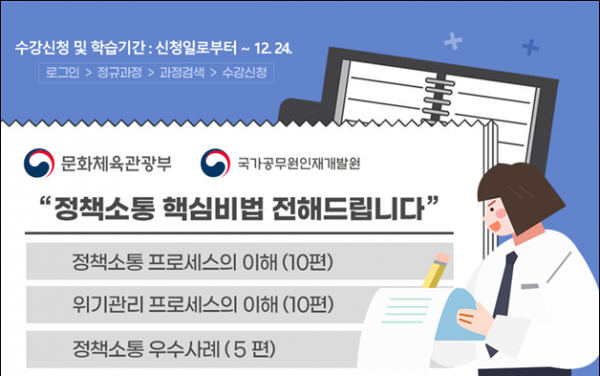 국가공무원인재개발원과 문화체육관광부는 디지털 공간에서 공무원들의 정책소통 역량을 높이기 위한 온라인 교육과정을 ‘나라배움터’에서 운영한다고 25일 밝혔다.