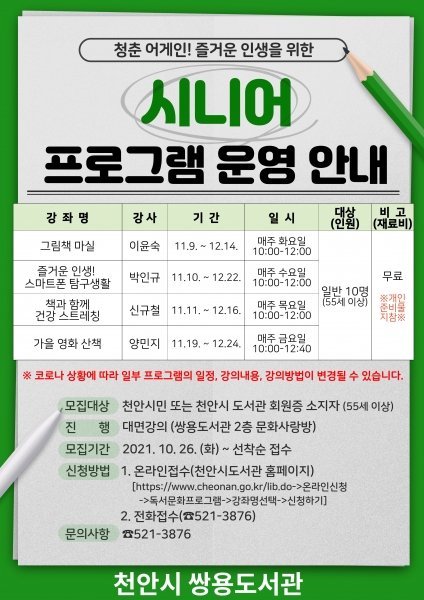 이번 프로그램은 55세 이상 천안시민을 대상으로 그림책을 읽고 함께 토론하는 ‘그림책 마실’ 스마트폰을 잘 활용할 수 있도록 돕는 ‘스마트폰 탐구생활’ 건강관련 책을 함께 읽고 건강 스트레칭도 배우는 ‘책과 함께 건강스트레칭’ 원작이 있는 영화를 함께 보고 토론 하는 ‘가을 영화산책’ 등 11월 9일부터 12월 24일까지 각 6회씩 다양하게 운영될 예정이다.