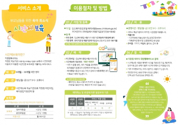 시간제보육은 양육수당을 받고 있는 가정에서 양육 중인 6개월 이상 36개월 미만 영아를 대상으로 보호자가 병원을 이용하거나 응급한 외출 등 다양한 사유로 급하게 아이를 맡길 곳이 필요한 경우 시간단위로 보육료를 지불하고 이용할 수 있는 서비스이다.