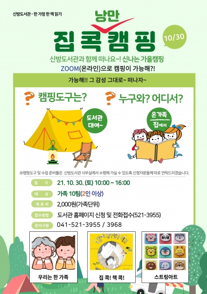 [세종타임즈] 가족특화도서관 ‘천안시 신방도서관’이 오는 30일 가족과 함께 떠나는 ‘집콕캠핑’ 프로그램을 실시한다.