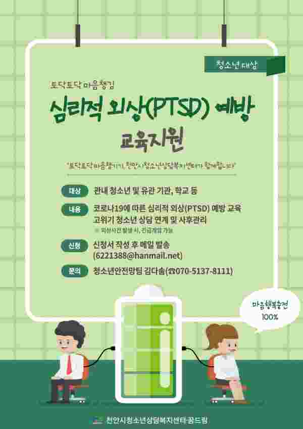 교육을 희망하는 기관은 천안시청소년상담복지센터 청소년안전망팀으로 신청하면 된다.