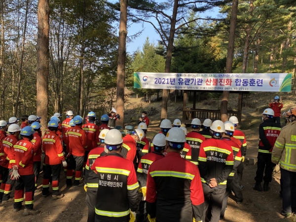 [세종타임즈] 서부지방산림청은 10월 27일 남원시 인월면 성산리 산80에서 함양국유림관리소, 남원시, 인월소방서와 함께 유관기관 합동 산불진화 훈련을 실시했다.