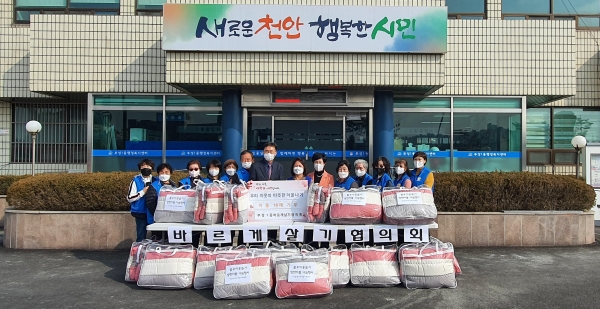 [세종타임즈] 천안시 부성1동은 바르게살기협의회가 지난 3일 지역 내 이웃을 위해 이불 18채를 기부했다고 밝혔다.