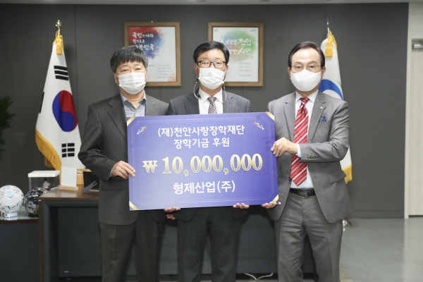 [세종타임즈] 형제산업 주식회사는 지난 8일 오전 천안시청을 방문해 천안의 인재 육성 및 어려운 학생을 위한 장학기금 1000만원을 재단법인 천안사랑장학재단에 전달했다.