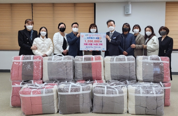 이날 천안 계광중 김정태 교장과 학부모회 김보란 회장을 비롯한 회원들이 봉명동행정복지센터를 방문해 어려운 이웃을 위해 사용해 달라며 후원금 120만원과 이불 14채를 전달했으며 특히 천안 계광중 학부모회는 수년째 학부모들의 정성을 모은 후원금품을 봉명동에 기탁하는 등 지역 사회의 귀감이 되고 있다.