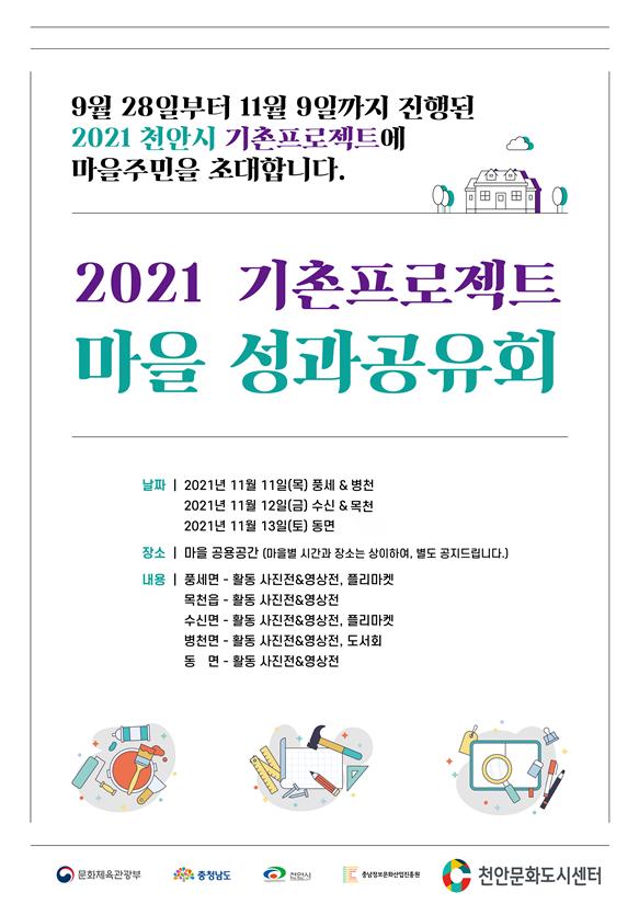[세종타임즈] 천안시와 충남정보문화산업진흥원, 천안문화도시센터는 ‘2021 천안시 기촌프로젝트’ 참여 주민들을 대상으로 오는 11일부터 13일까지 순차적으로 각 마을 공용공간에서 성과공유회를 개최한다고 밝혔다.