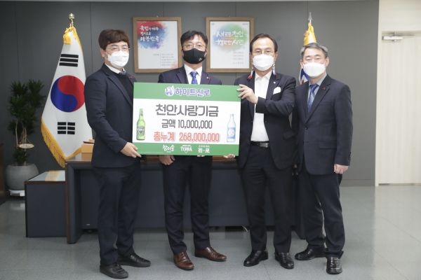 [세종타임즈] 하이트진로 천안지점은 지난 24일 천안시를 방문해 관내 어려운 가구 지원에 사용해 달라며 성금 1,000만원을 기부했다.