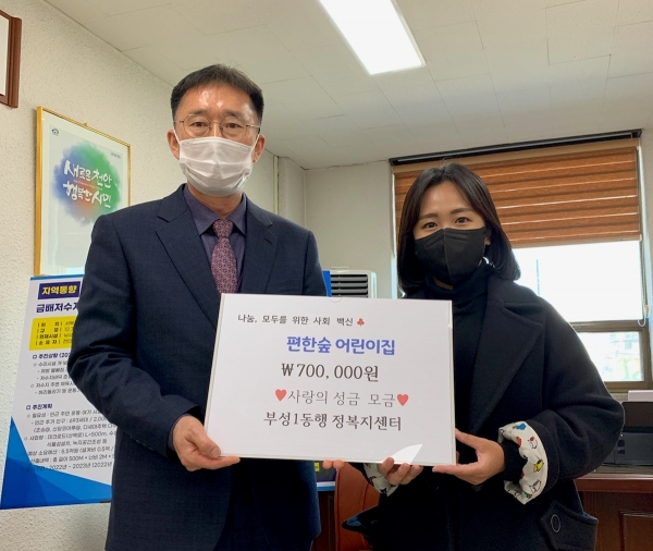 한익희 부성1동장은 “지역사회를 위해 소중한 기부를 해주신 편한숲 어린이집 아동들과 학부모님, 원장님께 깊이 감사드린다”며 “후원금은 어려운 이웃을 위해 소중히 사용하겠다”고 답했다.