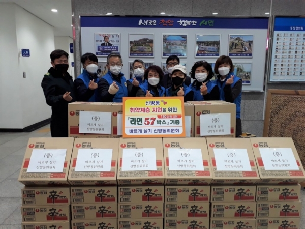 [세종타임즈] 천안시 신방동 바르게살기위원회는 지난 7일 소외계층을 위한 라면 57박스를 신방동행정복지센터에 기탁했다.