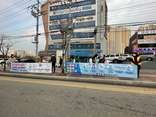 [세종타임즈] 천안시 백석동 자율방재단은 지난 9일 정석프라자 사거리에서 현수막과 홍보물 등을 이용해 코로나19 예방 캠페인을 진행했다.