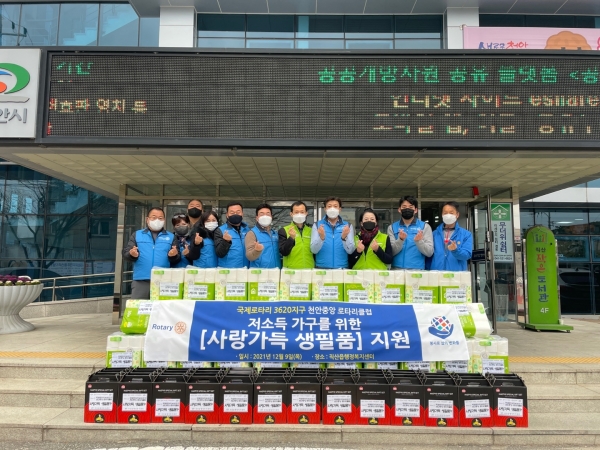 [세종타임즈] 천안중앙로타리클럽이 지난 9일 천안시 직산읍 저소득층 50가구를 위해 ‘사랑가득 생필품’을 지원했다.