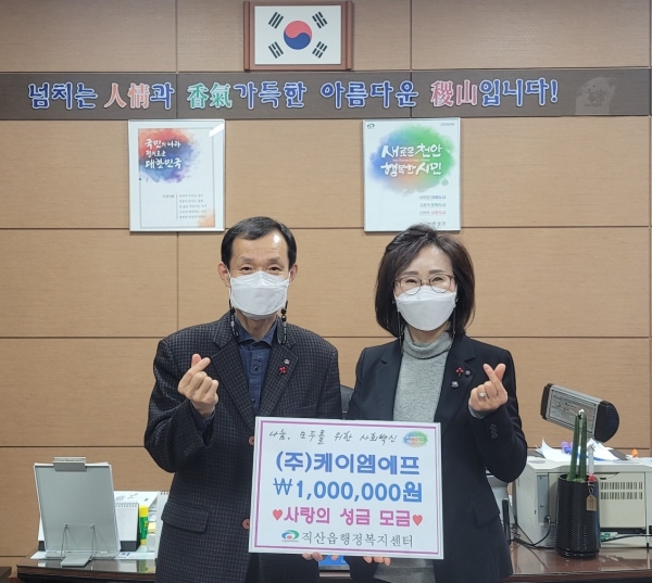 [세종타임즈] 천안시 직산읍은 ㈜케이엠에프에서 지난 15일 행정복지센터를 방문해 취약계층을 위한 이웃돕기 성금 100만원을 충남사회복지공동모금회에 기탁하며 희망2022나눔캠페인에 동참했다고 밝혔다.