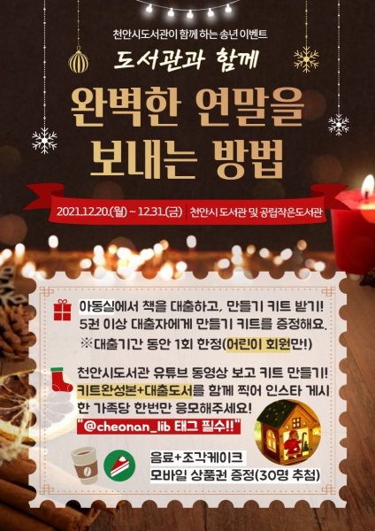 이번 행사는 12월 20일부터 12월 31까지 진행되며 천안시 공공도서관 아동실 및 공립 작은도서관에서 5권 이상 대출한 어린이들에게 크리스마스무드 등 만들기 키트를 선착순으로 제공한다.