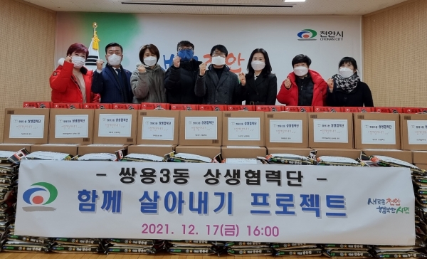 [세종타임즈] 천안시 쌍용3동 상생협력단은 지난 17일 지역 내 어려운 이웃을 돕기 위한 ‘함께 살아내기 프로젝트’의 일환으로 백미, 라면, 김을 전달했다.