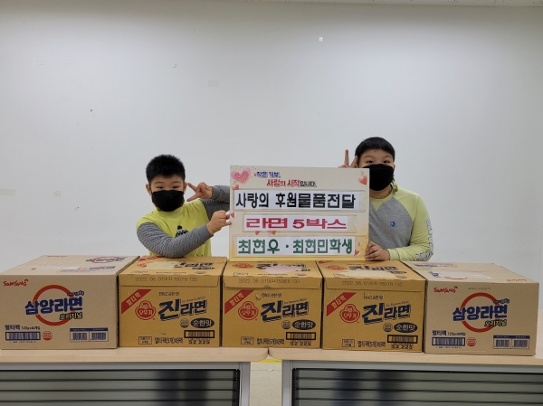 이번 후원은 최현우, 최현민 두 아이가 어려운 가정을 돕기 위해 수개월 간 모은 용돈으로 구입한 라면을 기탁한 것으로 홀몸노인 등 지역 내 취약계층 5가구에 전달될 예정이다.