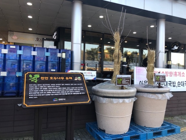 시는 휴게소 방문하는 방문객들에게 천안이 호두나무 시배지임을 알리고 우수한 천안 호두 품질을 홍보할 수 있도록 호두나무와 안내판을 설치했다.