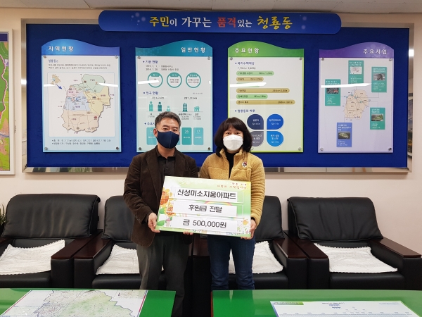 [세종타임즈] 천안시 청룡동은 지난 23일 천안신성미소지움아파트 입주민들이 불우이웃돕기 성금으로 50만원을 기탁했다고 밝혔다.