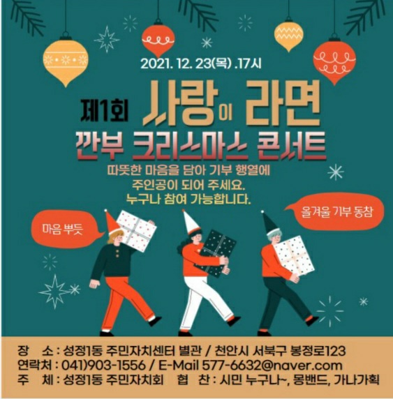 [세종타임즈] 천안시 성정1동 주민자치회는 지난 23일 주민자치센터 별관에서 기부와 함께하는 제1회 ‘사랑이 라면’ 깐부 크리스마스 콘서트를 개최했다.