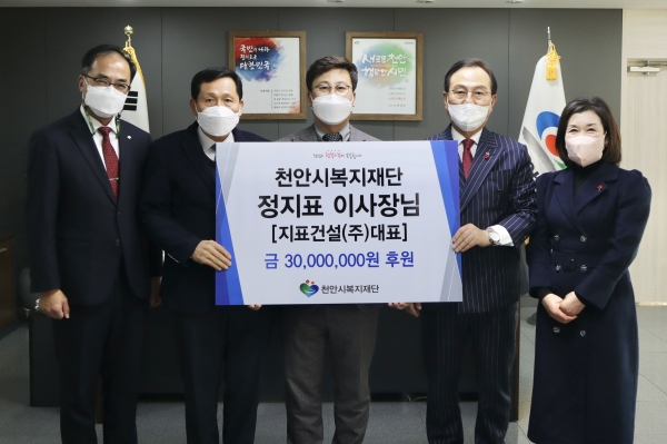 천안시복지재단 이사장이자 지표건설 대표이사인 정지표 씨는 “새해를 맞아 이웃사랑을 실천하고자 후원에 참여하게 됐다”며 “기업이윤을 사회에 환원해 지역사회에 상생과 나눔의 가치를 실현하겠다”고 말했다.