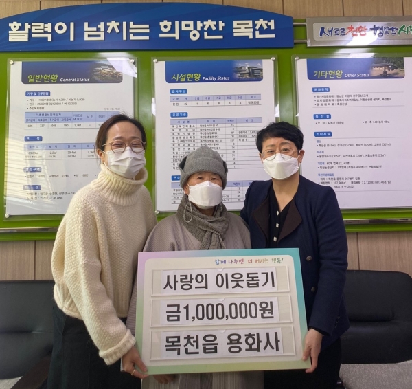 경영미 목천읍장은 “해마다 주민을 위해 성금을 기부해 준 용화사에 감사드린다”며 “복지사각지대에 놓인 지역주민 생활 안정을 위해 소중하게 사용하겠다”고 답했다.