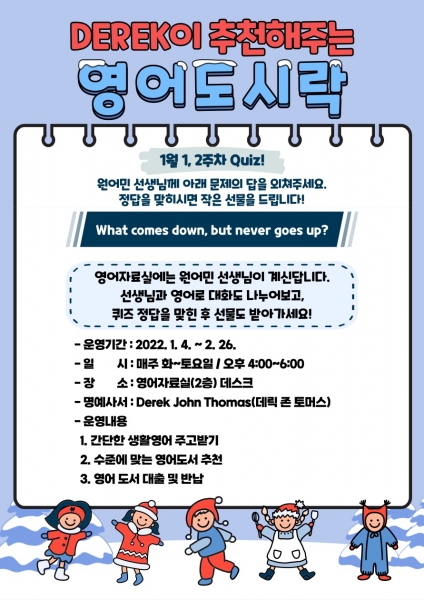 [세종타임즈] 천안시 청수도서관은 ‘2022년 겨울방학 아담·데릭이 추천해주는 영어도시락’을 운영한다고 밝혔다.