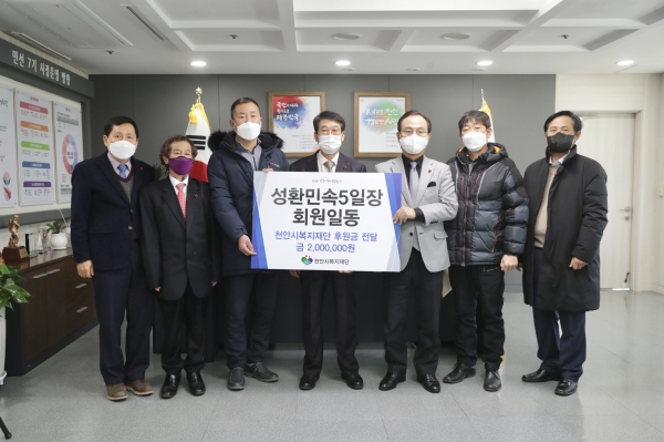 [세종타임즈] 천안 성환민속5일장 회원 일동이 지난 12일 천안시청 시장실에서 관내 취약계층 지원을 위한 후원금 200만원을 천안시복지재단에 전달했다.