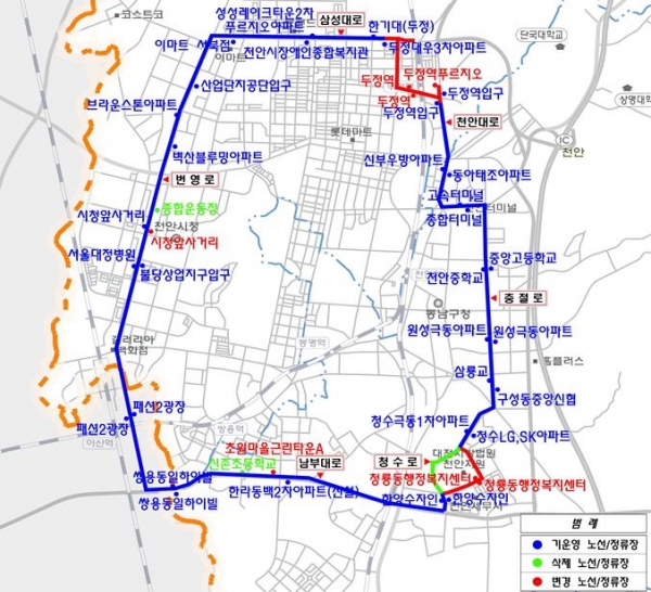 이에 따라 시계방향 기점과 종점은 모두 두정역입구로 변경되고 반시계방향 기점은 두정역푸르지오, 종점은 두정역입구로 바뀐다.