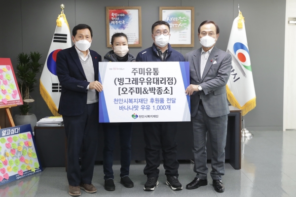 주미유통은 지난 21일 설 명절을 맞이해 바나나맛 우유 1,000개를 천안시복지재단에 전달했다.
