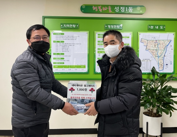 쌍용프라자는 내비게이션 판매 및 사후서비스 업체로 매년 내비게이션을 업그레이드하는 비용을 모금함에 1,000원부터 2만원까지 모아 마련한 기부금을 성정1동 행정복지센터에 전달하고 있으며 올해도 총 367,600원의 이웃돕기 성금을 전달했다.
