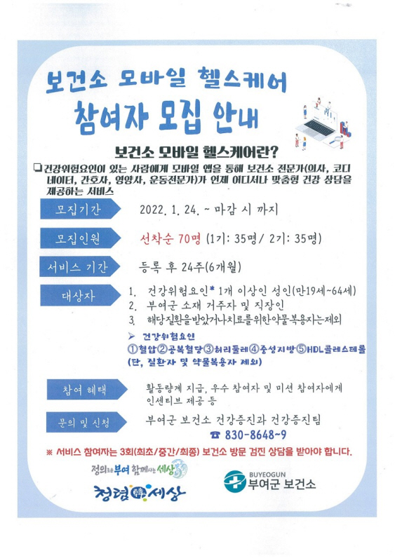 [세종타임즈] 부여군은 ICT 기반 공공형 건강관리서비스인 2022년 보건소 보마일 헬스 케어 사업을 시작한다고 밝혔다.