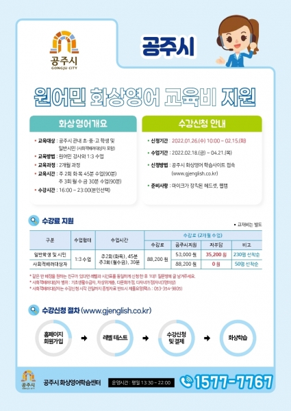 관내 초·중·고등학생 및 일반 시민이면 누구나 공주시 원어민 화상영어 교육 홈페이지에서 수강 신청이 가능하다.