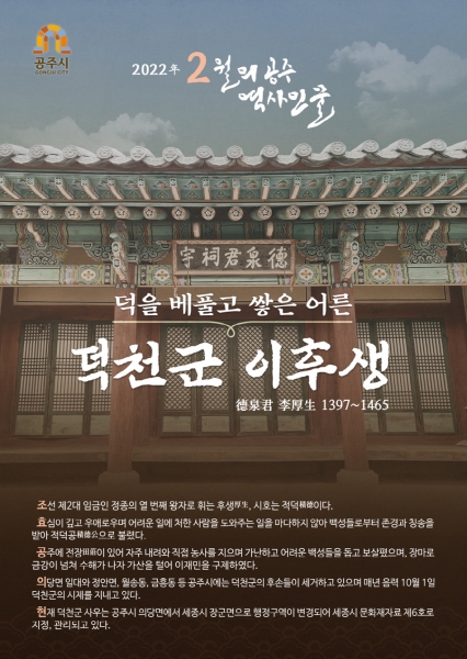 김정섭 시장은 “공주를 고향으로 삼은 전주이씨 덕천군파의 파시조이자 가난하고 어려운 백성들을 살핀 덕천군 이후생의 삶과 업적을 기리기 위해 2월의 역사 인물로 선정했다”며 “오는 2월 18일 공주대학교 국제회의실에서 덕천군 이후생 관련 학술특강을 개최할 예정이다”고 말했다.