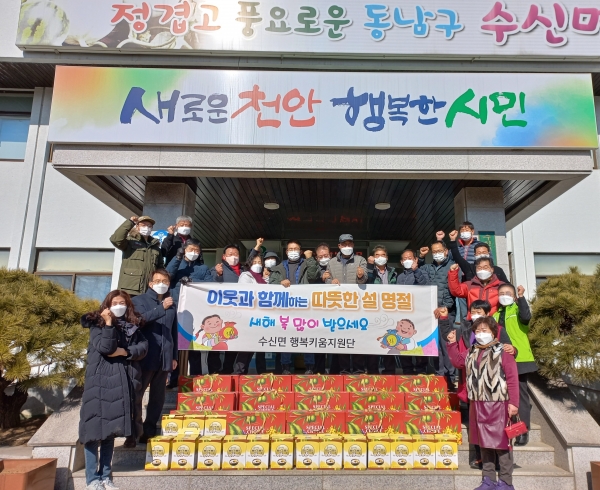 [세종타임즈] 천안시 수신면은 지난 1월 29일 수신면 행복키움지원단이 설 명절을 맞아 홀몸노인 등 관내 취약계층 30가구에 식료품 선물세트를 지원했다고 밝혔다.