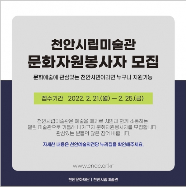 [세종타임즈] 천안문화재단 천안시립미술관은 관람객에게 양질의 관람서비스를 제공하고 문화예술향유 기회를 확대하고자 2022년 천안시립미술관 문화자원봉사자를 오는 25일까지 모집한다.