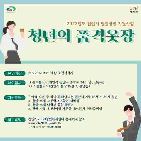 신청은 천안시2030청년복지센터 누리집 ‘청년의 품격옷장’ 신청페이지에 접속해 설문을 작성하고 메일로 증빙서류를 제출하면 된다.