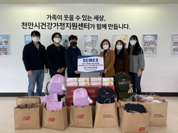 ‘2022 너희들의 꿈을 응원해’라는 주제로 진행된 이번 전달식에서 세메스는 임직원 자선경매를 통한 수익금과 세메스 후원금 총 250만원 상당을 2022년도 초·중·고등학교 입학을 앞두고 있는 저소득 취약가구 학생 22명의 책가방과 학용품으로 지원해달라고 밝혔다.