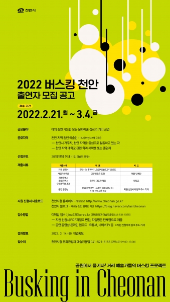 공모 분야는 버스킹 가능한 모든 장르의 공연 문화예술 분야로 천안시에 거주하거나 천안 지역 관련 학과 대학 졸업자, 지역을 중심으로 활동하는 18세부터 39세 이하 청년 예술인이면 누구나 신청할 수 있다.