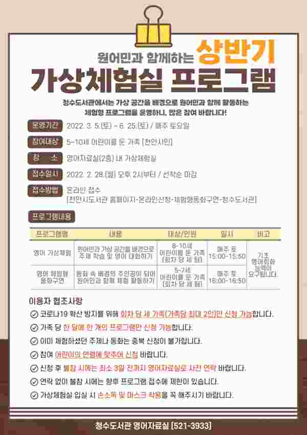 [세종타임즈] 천안 청수도서관은 3월부터 ‘상반기 원어민과 함께하는 가상체험실 프로그램’을 운영한다고 밝혔다.
