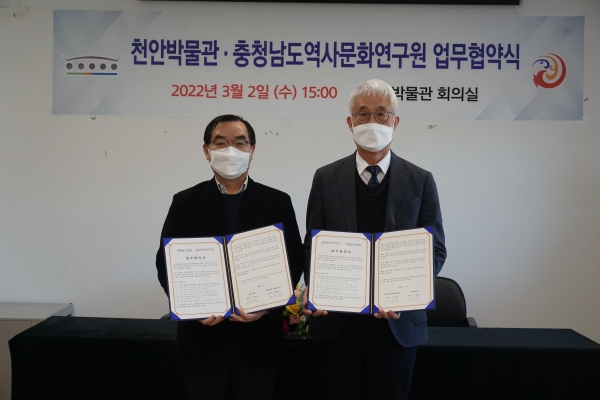이날 협약식은 이종택 천안박물관장과 조한필 충청남도역사문화연구원장 등이 참석한 가운데 양 기관 간 전략적 업무협약을 통해 필요 사업 공동 수행을 목표로 상호 협력 체제를 구축하기로 했다.