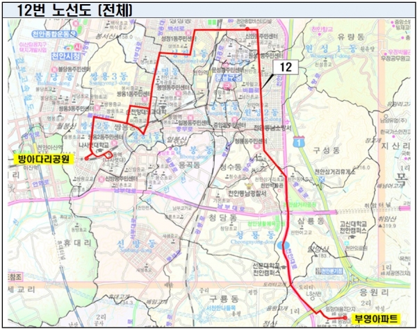 기존 방아다리공원부터 나사렛대를 지나 목천 부영아파트까지 운행하던 12번 시내버스는 방아다리공원에서 쌍용역을 경유해 나사렛대를 거쳐 목천 부영아파트까지로 변경된다.