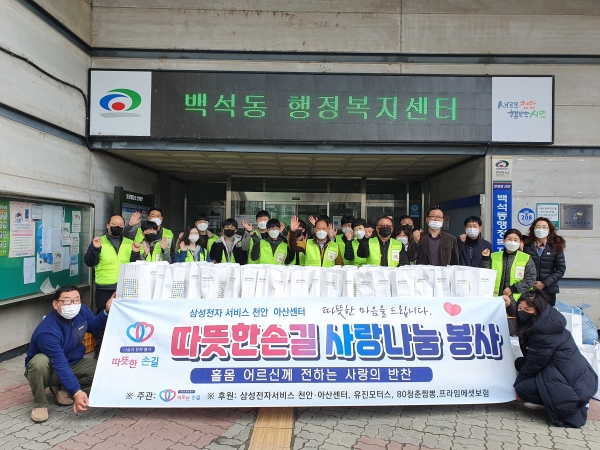 이날 나눔 활동은 삼성전자서비스 중부지사의 지원을 받아 봉사자 40여명이 참여했고 백석동의 홀몸노인·조손가정 등 어르신들을 위해 봉사단원들이 직접 음식을 만들고 도시락을 손수 포장해 대상자 가정에 방문해 전달했다.